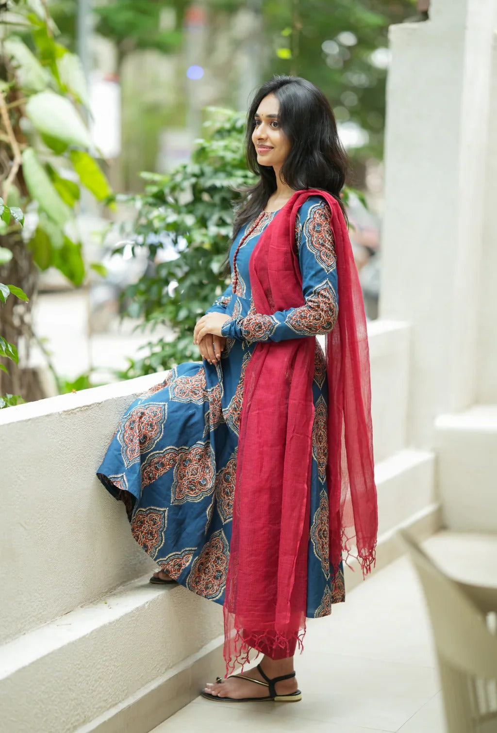 Blue Printed Cotton Anarkali Kurta with Maroon Dupatta