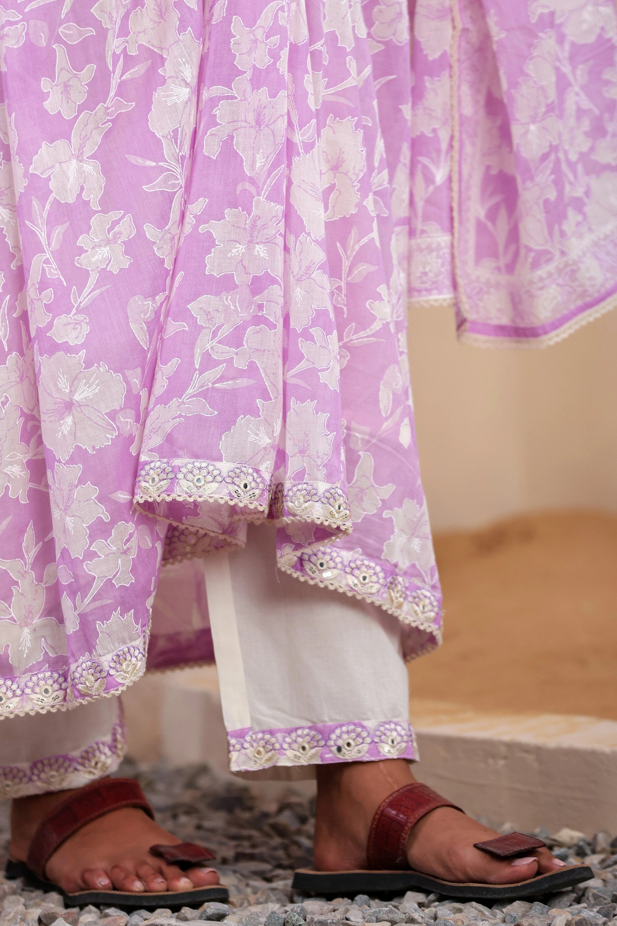 Lavender & White Floral Printed Anarkali Kurta Set with Dupatta