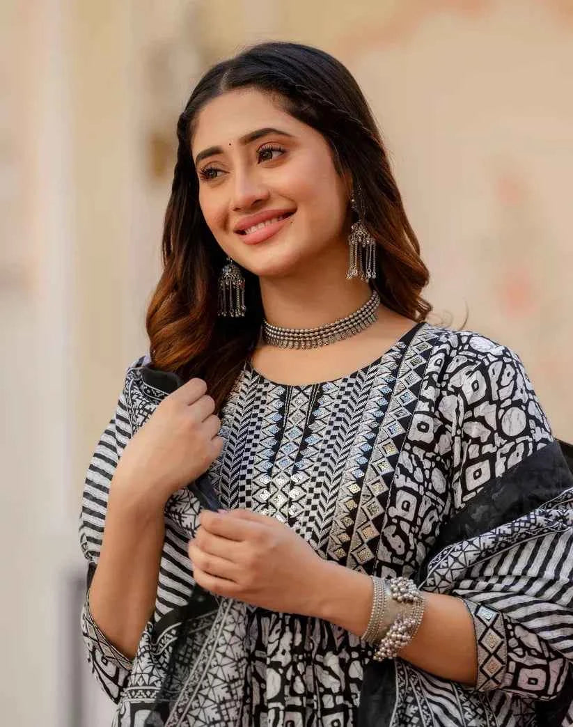 Made from premium quality cotton, this outfit ensures all day comfort ideal for office wear, festive gatherings, brunch dates, or casual outings. The monochrome palette adds a classy touch, making it a versatile ethnic essential for every wardrobe.