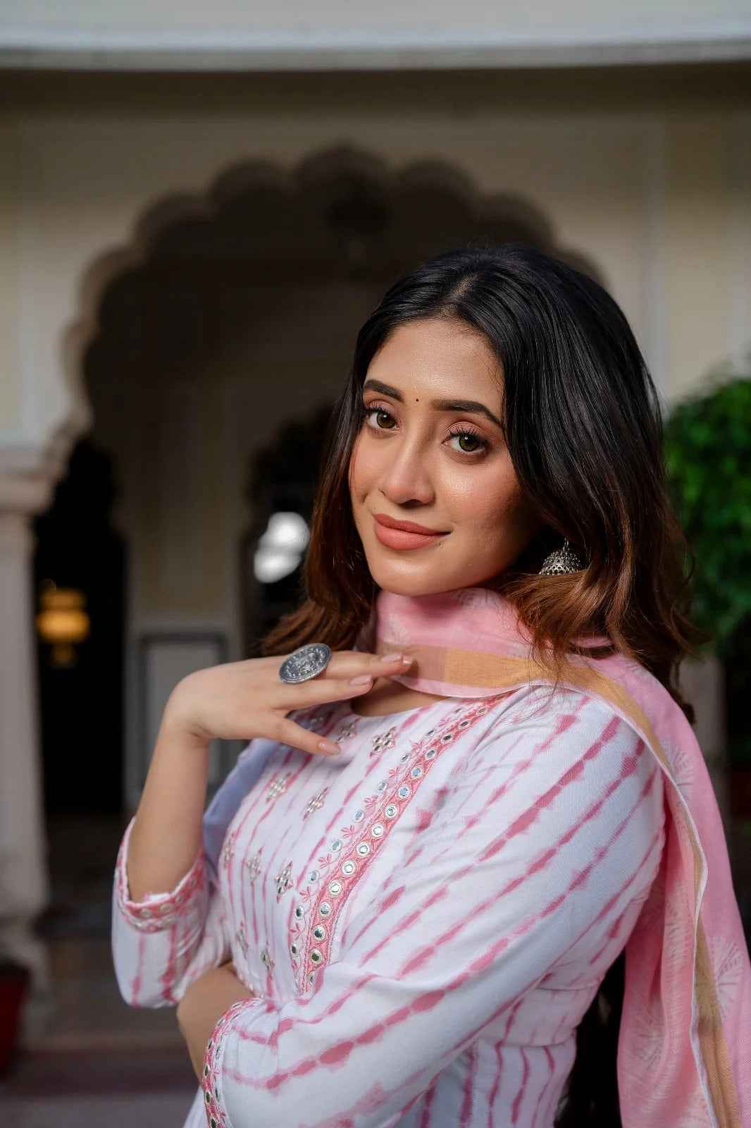Print/Embellishment: Subtle pink vertical stripes on a white base, with intricate embroidery on the yoke