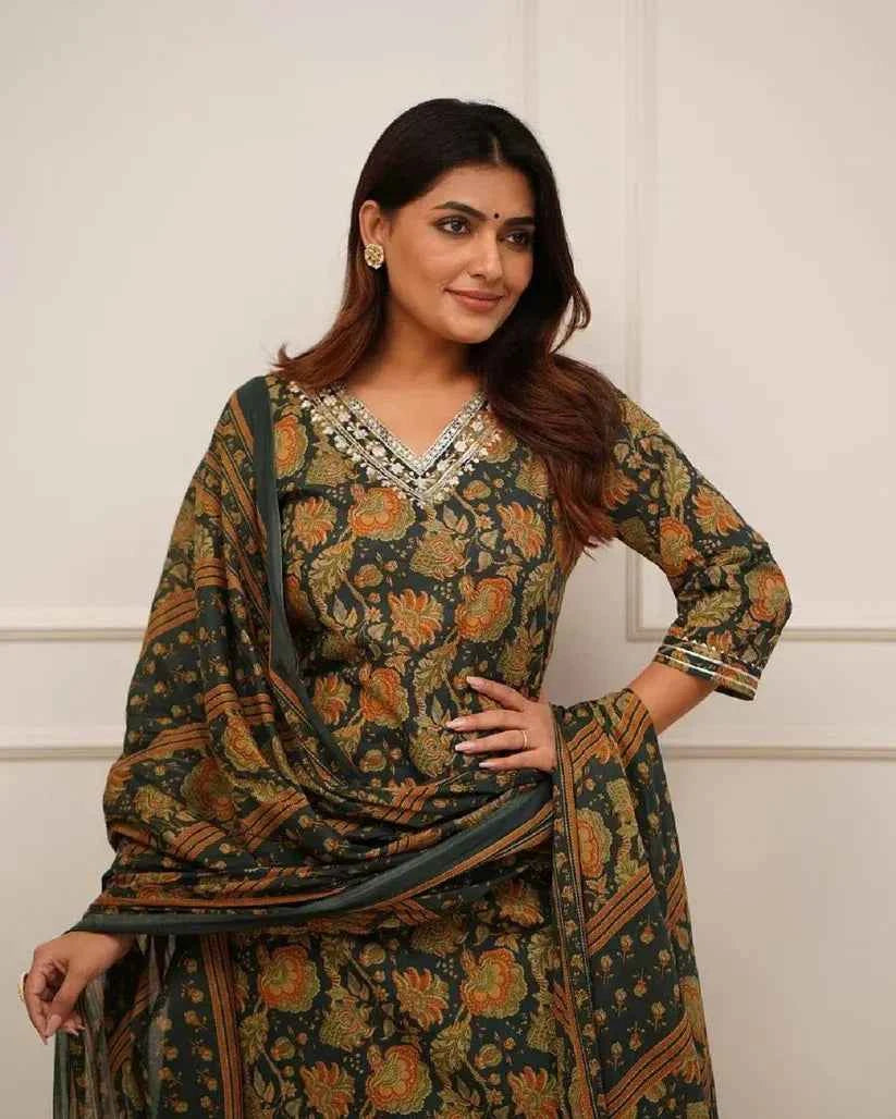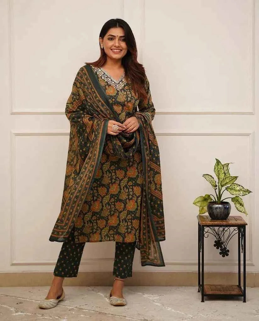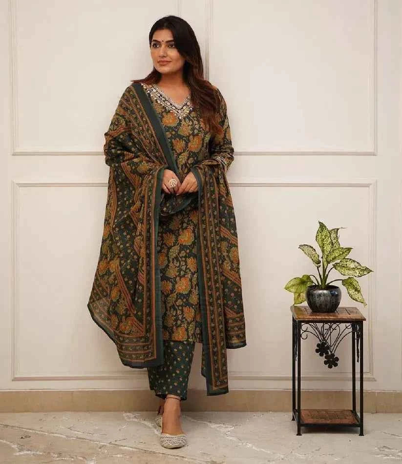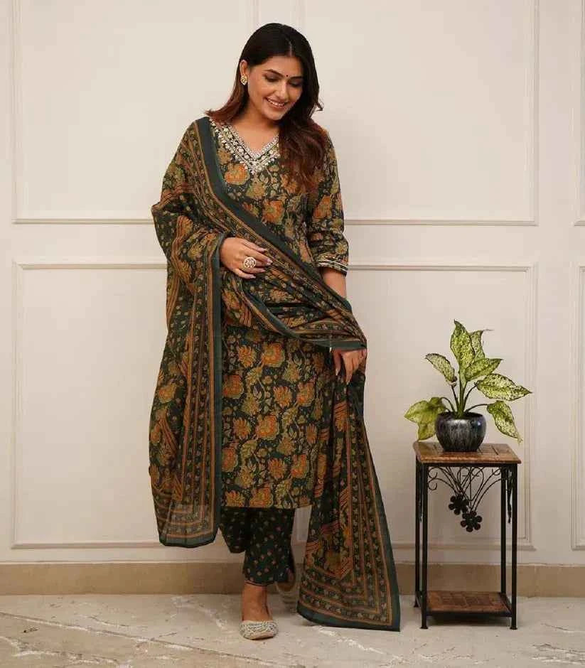 Refresh your everyday ethnic style with this stunning bottle green floral printed cotton suit set, designed for women who love comfort, elegance, and effortless charm. Featuring intricate ethnic prints in warm mustard and green tones, this suit set adds a touch of tradition to your daily wardrobe.