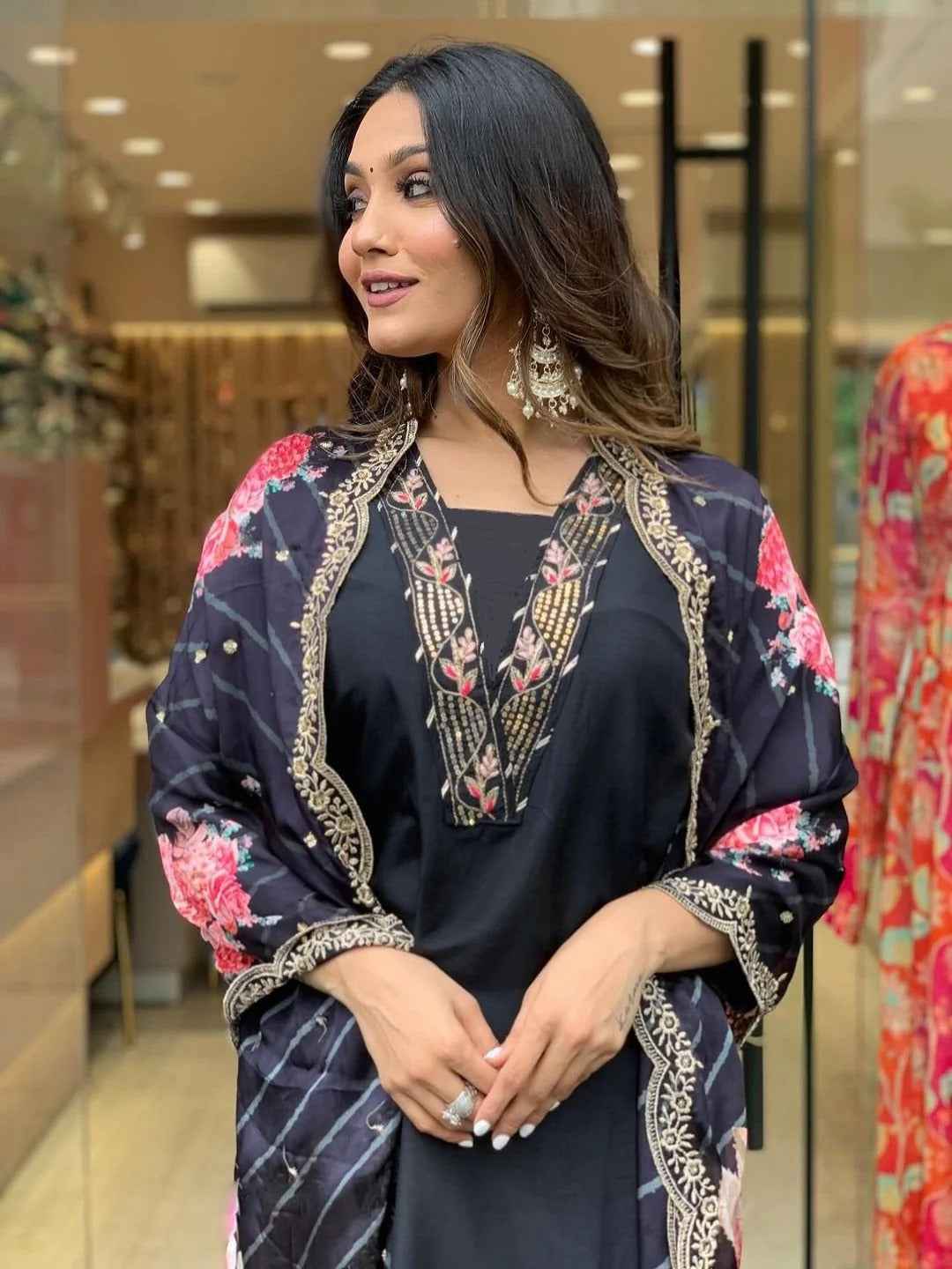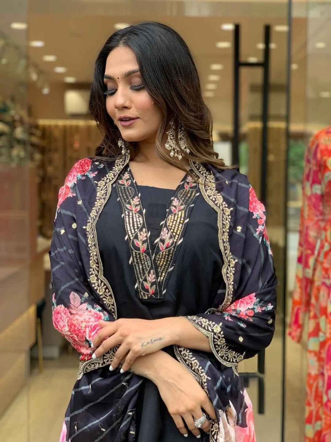 Elevate your festive and party wardrobe with this stunning Black Floral Printed Suit Set, designed for women who love bold elegance and luxurious ethnic fashion. The solid black kurta is paired with matching pants, creating a sleek and graceful silhouette perfect for any occasion.