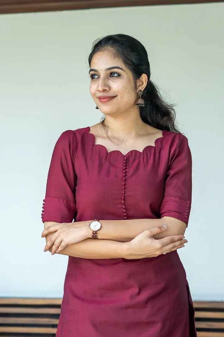 Step into effortless elegance with this maroon cotton kurti set, designed for women who love minimal yet classy ethnic wear. Made from soft, breathable cotton, this straight kurta features a scallop neckline and scallop hem design, adding a touch of feminine charm to your everyday look. The subtle woven motifs on the kurta bring a sophisticated appeal while keeping the style simple and timeless.
