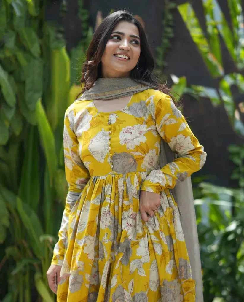 Freshen up your festive wardrobe with the Golden Radiance Viscose Suit Set, crafted from premium viscose fabric that flows with elegance and comfort. This mustard yellow kurta features a delicate floral print in pastel tones, paired with graceful front pleats and fabric buttons that lend a subtle charm. The soft, coordinated pants and organza-like dupatta add a refined finish to the look.