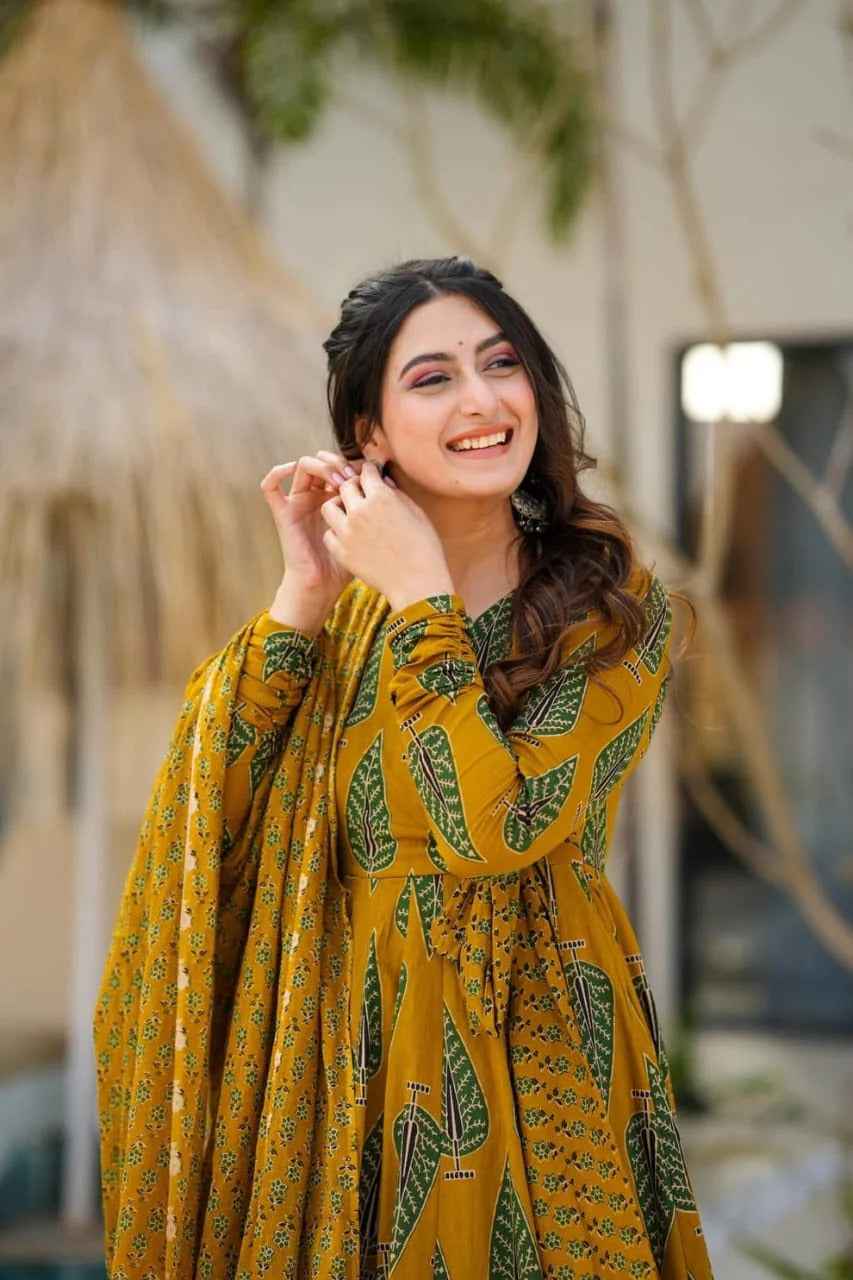 Bring effortless charm to your ethnic wardrobe with this stunning Mustard Yellow Leaf Print Anarkali Kurta Set, designed for women who love vibrant tones and comfortable, flowy silhouettes. Crafted from soft, breathable cotton, this flared Anarkali kurta comes in a rich mustard shade adorned with beautiful green leaf prints, giving it a refreshing and earthy appeal.