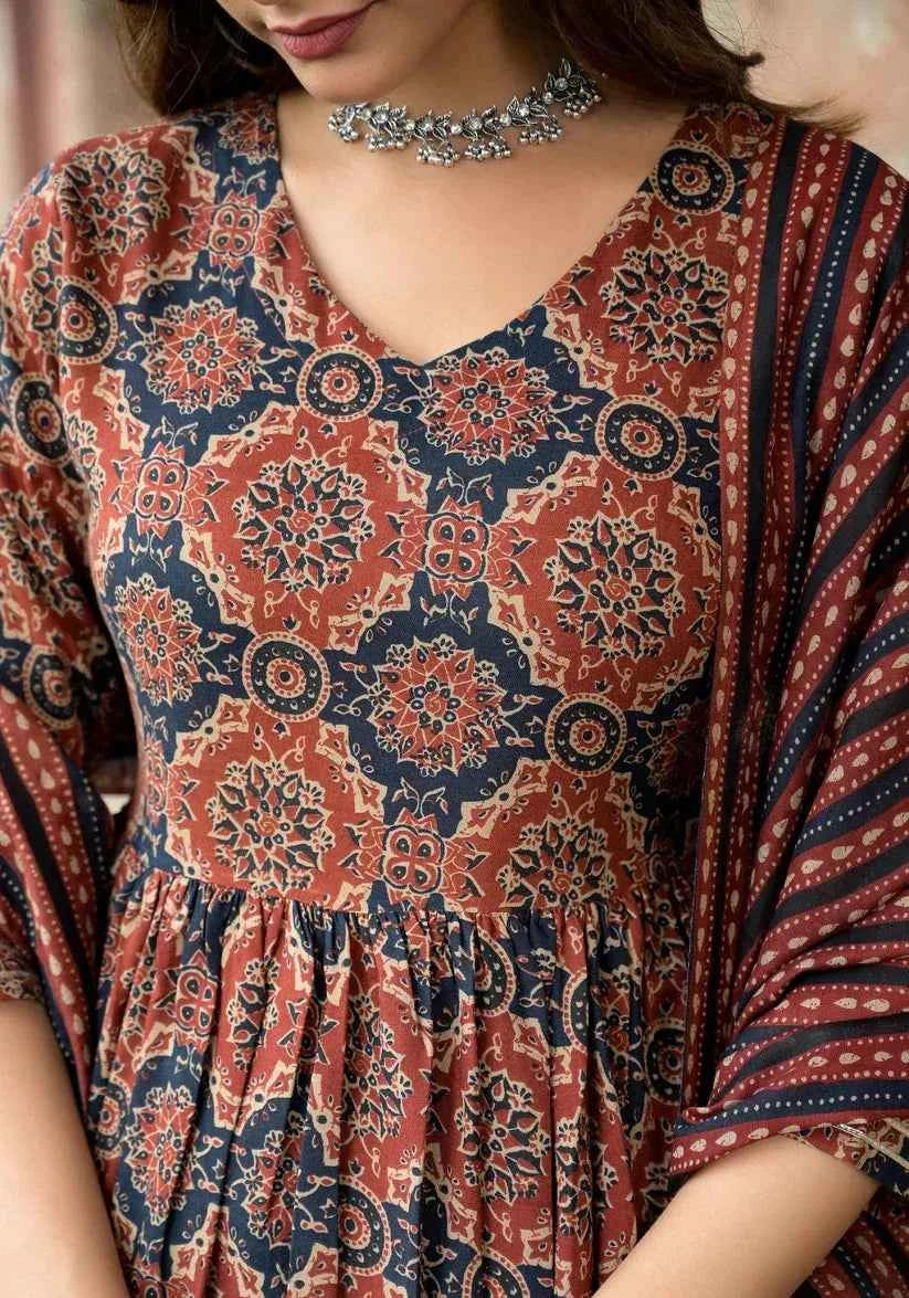 Rust & Navy Ethnic Printed Anarkali Kurta Set with Dupatta