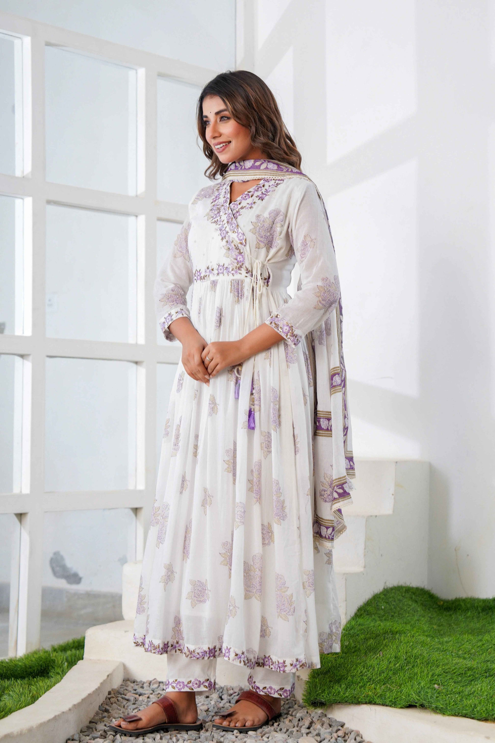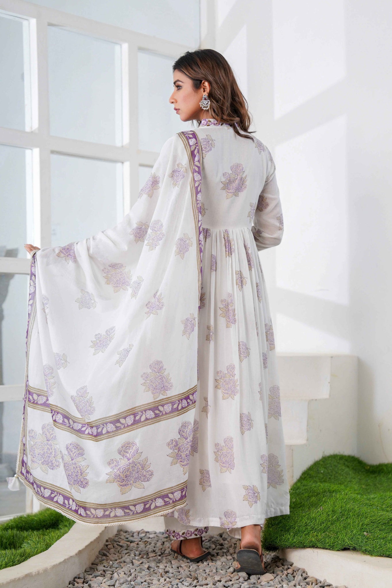 White & Lavender Floral Anarkali Kurta Set with Dupatta