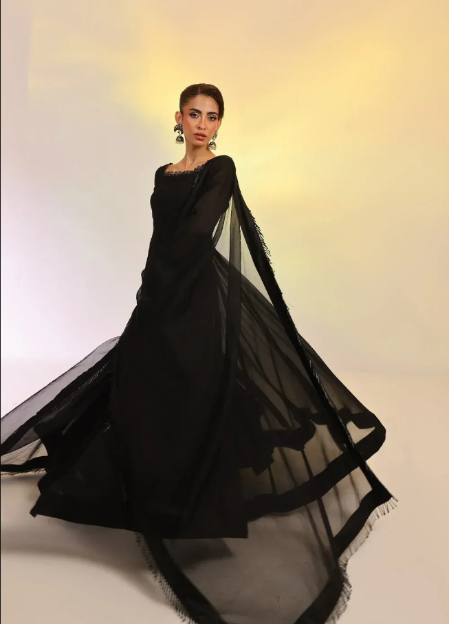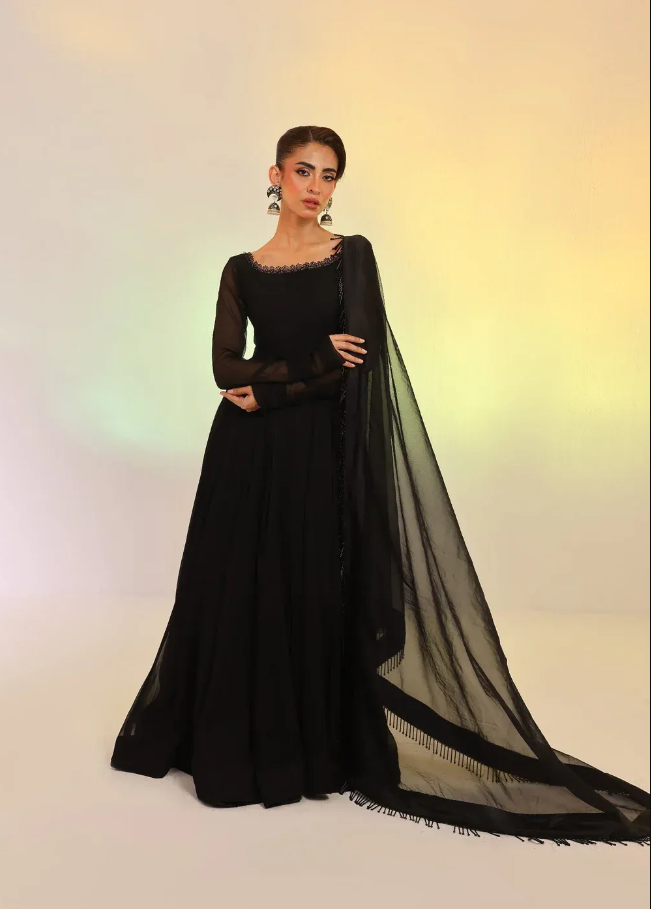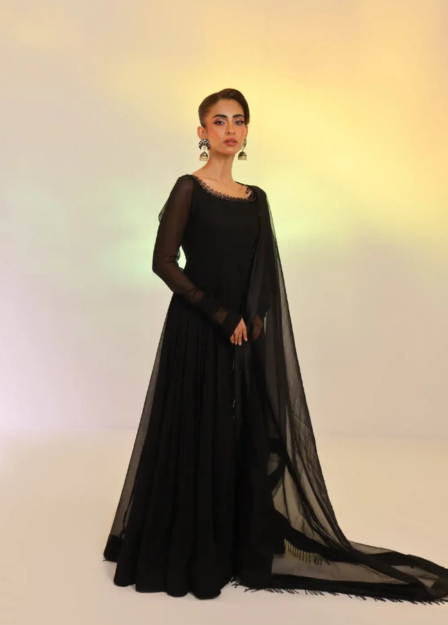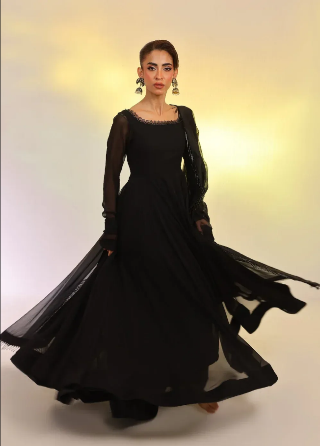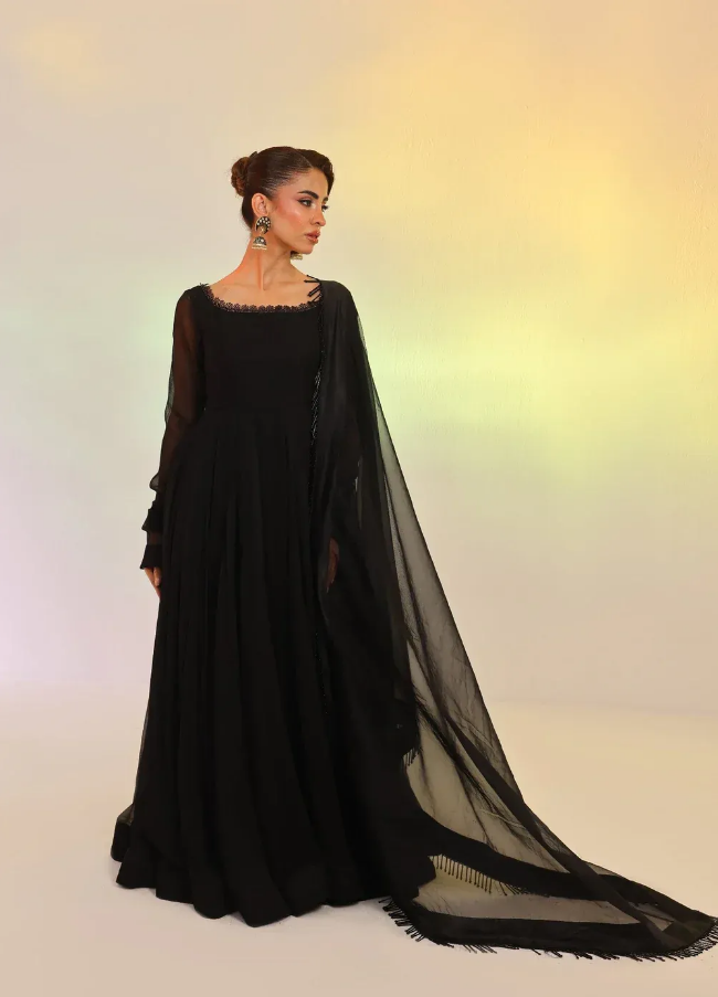 Additional Description: Frock: Type: Kalidaar Fabric: Crinkle Chiffon 350+ Inches of Flare (Made with Over 20 Yards of Fabric) Lace Detailing on Neckline Long Sleeves Fully Lined with Malayi Fabric Style: Churidaar Dupatta: Type: Organza crystal lace on all 4 sides Length: 3 Yards SIZE & FIT Model Height: 5'6 Model Wears Size: S