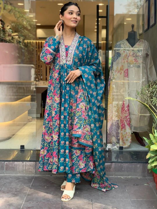 Step into a garden of vibrant hues with the Teal Blossom Viscose Suit Set. Crafted from flowy and breathable viscose fabric, this ensemble features an all over floral print in pinks, yellows, and greens on a serene teal base. The kurta is tailored in a flattering anarkali silhouette with a delicately embroidered neckline, offering a perfect blend of elegance and comfort.
