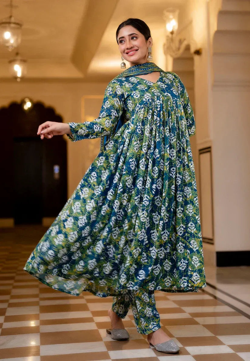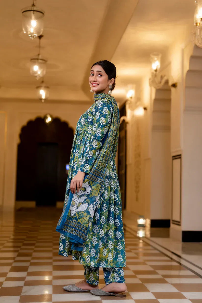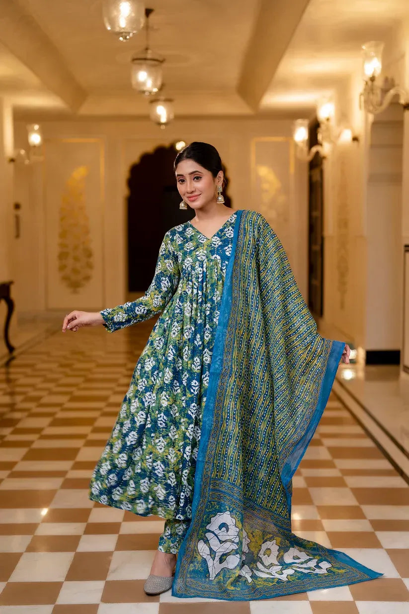 The Anarkali kurta€™s flattering flared silhouette boasts a classic V-neckline with delicate gathers, providing a comfortable and graceful drape that flows beautifully with every movement. The comfortable, straight-cut trousers feature a complementary subtle pattern, completing the elegant and cohesive look. Completing the ensemble is a beautifully patterned dupatta featuring harmonious stripes and large botanical outlines in shades of blue and yellow, enhancing its overall ethnic allure. Ideal for festive occasions, daytime events, or adding a touch of refreshing sophistication to your wardrobe.