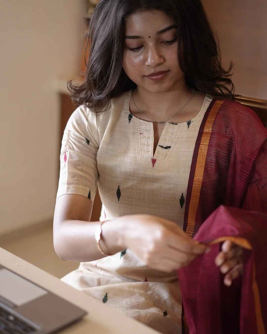 Cream Ikat Cotton Kurta Set with Maroon Dupatta for Women