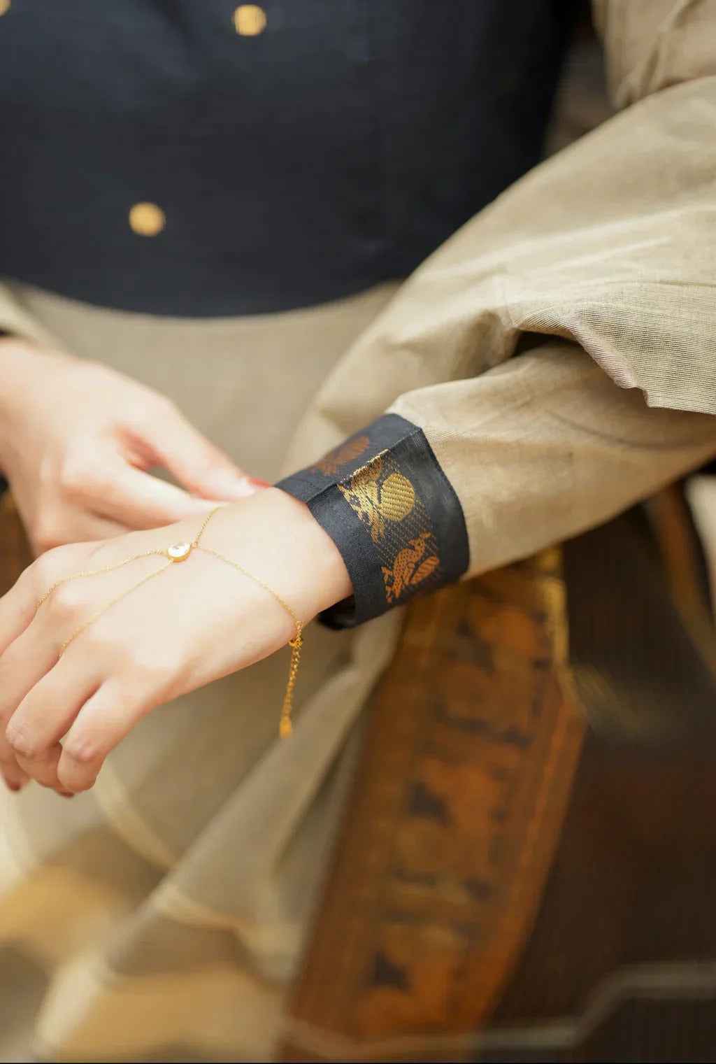 The real highlight of the ensemble is the traditional Banarasi dupatta showcasing intricate zari weaving, classic temple borders, and antique gold motifs. The combination of deep black, soft beige, and shimmering gold creates a timeless ethnic charm perfect for special occasions.